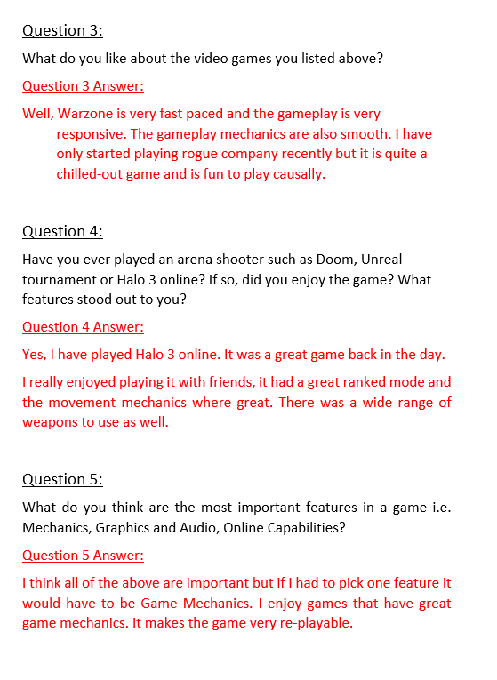 The next problem we encountered was deciding which genre of game to make. There are a ton of options such as Battle royals, FPS, Racing, RPG’s etc. After carefully scanning the market to see which games where most popular at the moment and conducting interviews and questionnaires, we decided that the Arena Shooter genre would be a good genre to go with. The Arena Shooter genre was once a very popular genre but has recently declined due to other genres such a Battle Royals taking over the market. We felt that this might present an opportunity to bring out an Arena shooter and restore the genres popularity.